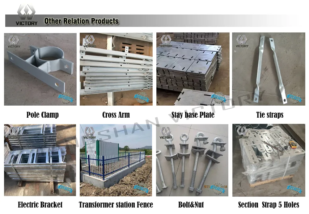 The power parts are applied to the pole or tower to support the main component of the power transmission cable. Mainly including Electric cross arm, Electric pole Hoop, hot dip galvanized LV house angle iron steel cross arm, Electric bracket and Transformer Fence.